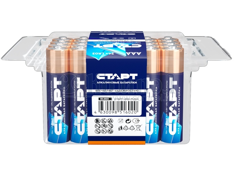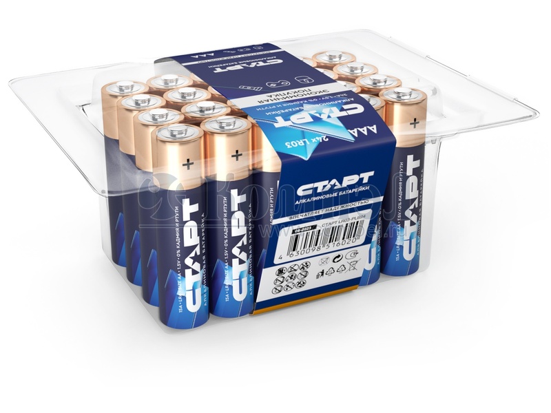Щелочные батарейки «Старт» в новом эргономичном боксе Преимущества Щелочные батарейки «Старт» типоразмера ААА «мизинчиковые» рассчитанных на работу в устройствах с большим потреблениям энергии: в медицинских приборах, туристических фонарях, радиоуправляемых детских игрушках, автосигнализациях. Новую линейку отличает удобная и функциональная упаковка. Комплект батареек помещен в прозрачный компактный бокс, который очень удобен в пользовании и хранении. Батарейки в такой упаковке не рассыпаются. Бокс легко открывается и закрывается. Отличный вариант для транспортировки и хранения батареек дома, в офисе, машине. Пластиковый корпус защитит батарейки от негативного внешнего воздействия, продлевая срок службы. Безопасность Щелочные батарейки «Старт» абсолютно безопасны. Корпус герметичен. Элементы питания запрещается самостоятельно разбирать, деформировать корпус, бросать в огонь. Использованные батарейки не выбрасывайте вместе с другим бытовым мусором. Отслужившие свой срок элементы питания следует отнести в специальные пункты. Контейнеры для сбора батареек установлены во многих торговых центрах. Технические характеристики Рабочее напряжение, В: 1,5 Типоразмер: LR03 (ААА) Вид батарейки: Щёлочная (Alkaline) Диаметр: 10,5 мм Высота: 44,6 мм Упаковка: пластиковый бокс Количество батареек в упаковке, шт.: 24 Температура эксплуатации: от -18° до +50° Срок годности, лет: 10