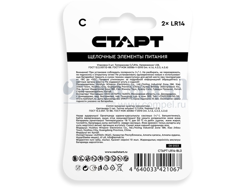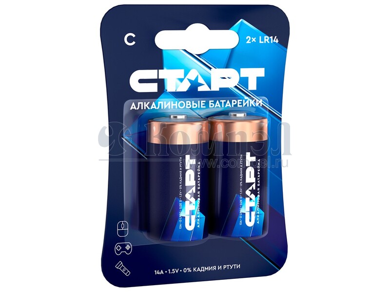 Набор из 2-х элементов питания типоразмера C («бочонок») от компании СТАРТ, отличающихся повышенной энергоёмкостью. Батарейки этой модификации способны работать без потерь своих характеристик и в жару, и в морозы. Температурный диапазон широк - от -18°C до +50°С. Это означает, что приборы, питающиеся от элементов СТАРТ LR14, будут полноценно функционировать на улице практически при любых погодных условиях.Алкалиновые батарейки от СТАРТа могут не только долго работать, но и храниться. Причём за 10 лет неиспользования они потеряют не более 10% от своего номинального заряда, что является большим преимуществом по сравнению с солевыми батарейками, которые полностью разряжаются за 2-3 года хранения.Характерная форма батареек («бочонок») несколько ограничивает сферу их применения, однако такие элементы идеальны для приборов с повышенным энергопотреблением.