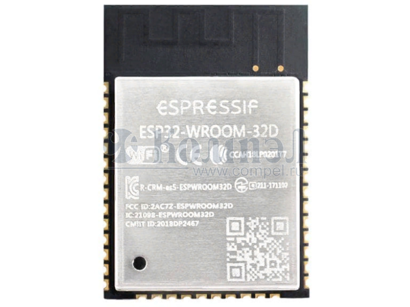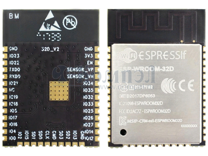 | P= | ESP32-WROOM-32D [4MB] (ESPRES) | — | в ленте 650 шт | — | — | GPIO, I²C, I²S, PWM, SDIO, SPI, UART | — | Chip ESP32-D0WD, Xtensa 32-bit LX6, 448kB ROM, 536kB SRAM, 4MB SPI flash, 802.11b/g/n, Bluetooth v4.2 + EDR, Class 1, 2, 3 | ||||||||||||