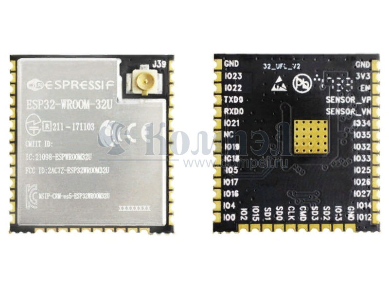 | F~ | ESP32-WROOM-32U [4MB] (ESPRES) | — | в ленте 650 шт | — | — | GPIO, I²C, I²S, PWM, SDIO, SPI, UART | — | Chip ESP32-D0WD, Xtensa 32-bit LX6, 448kB ROM, 536kB SRAM, 4MB SPI flash, 802.11b/g/n, Bluetooth v4.2 + EDR, Class 1, 2, 3 |