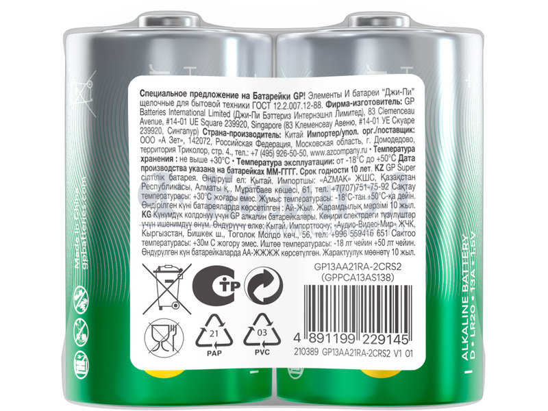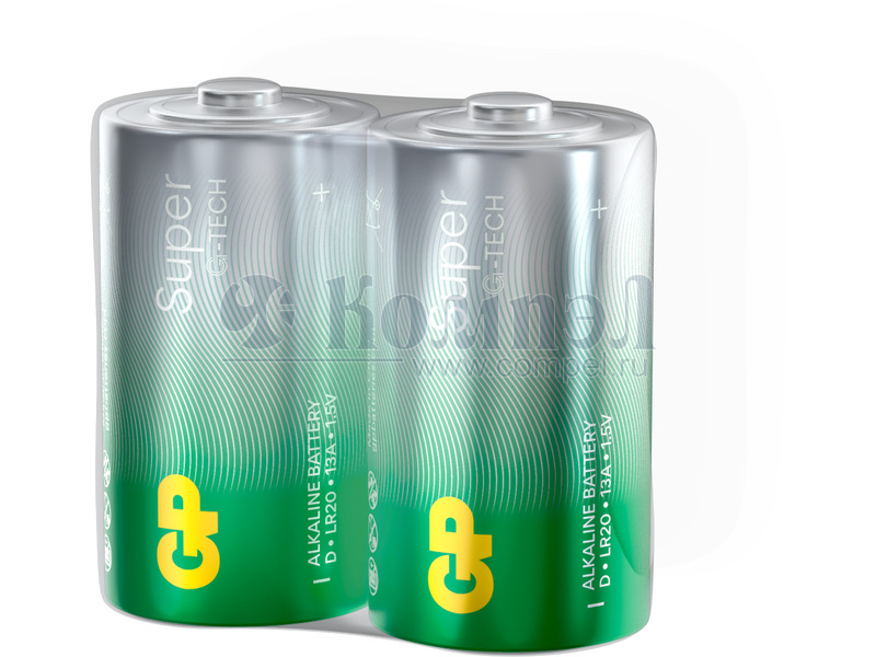 Алкалиновые батарейки GP Super Alkaline G-Tech 13А типоразмера D - 2 шт. в пленке (Китай) Характеристики: 1,5 В Типоразмер D, LR20 Номинальная емкость: 14300 мАч 2 шт. в шринке