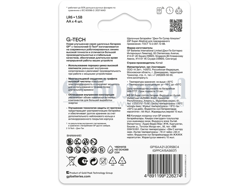 | Примечания | LR6 Super G-Tech АА blister 4, блистер, 4 шт. (4891199226274) |