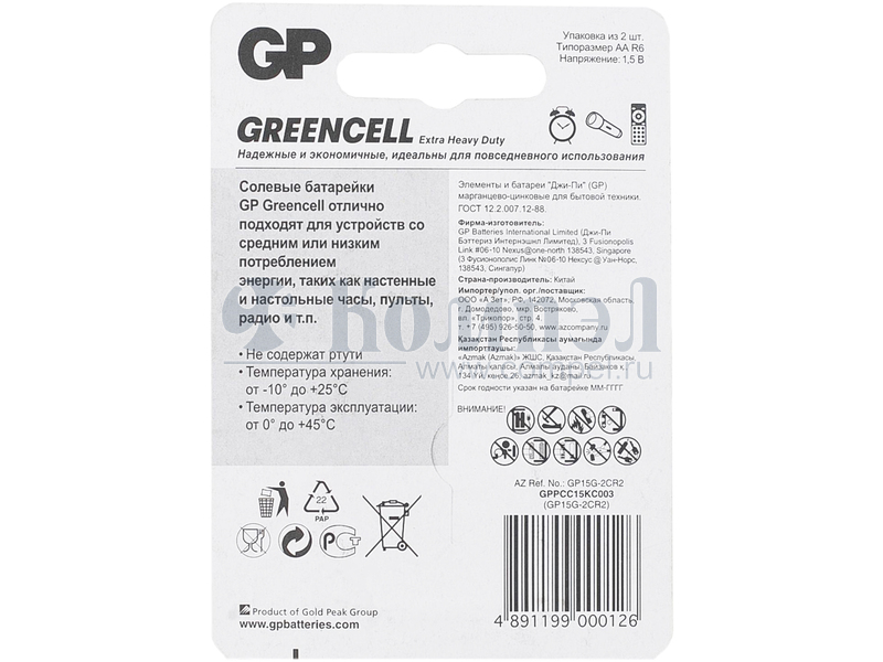 | Примечания | GP 15G-2CR2, блистер, 2 шт. (4891199000348) |