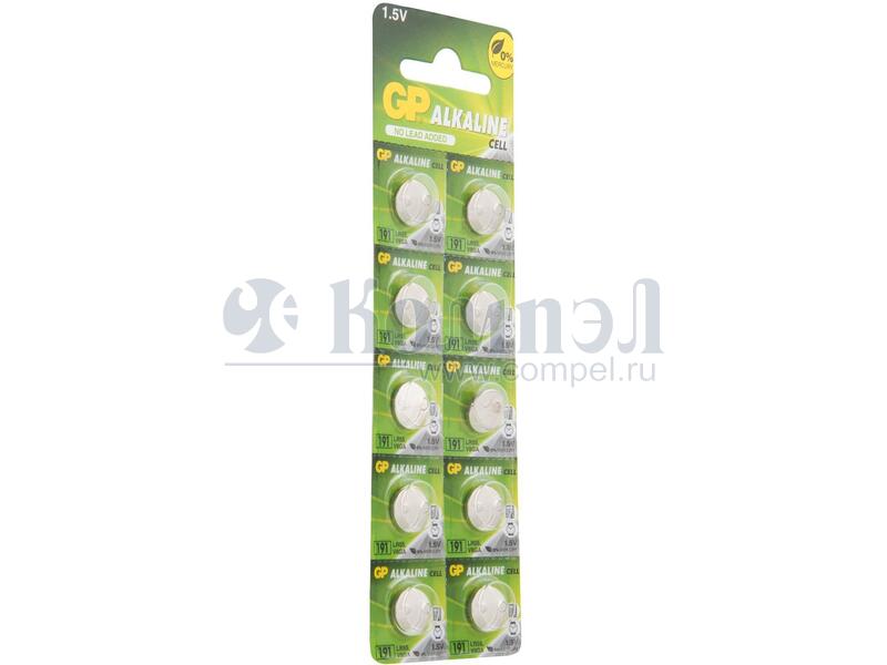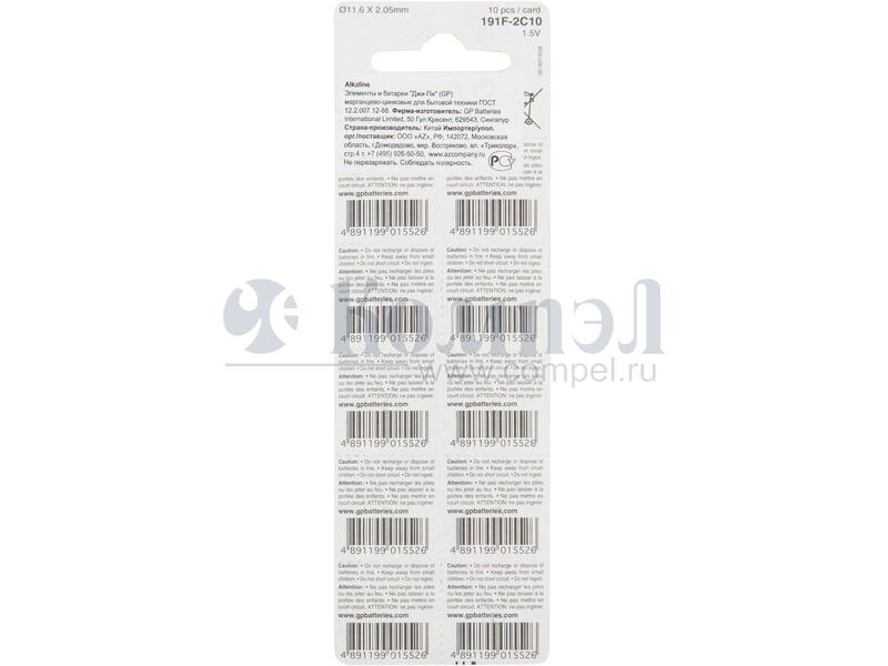 Алкалиновые пуговичные батарейки GP 191A - 10 шт., каждая в своем отрывном блистере (Китай) Характеристики: 1,5 В Номинальная емкость: 24 мАч Аналоги: LR55, G8, V8GA, LR1120, 191 10 шт. на отрывном блистере