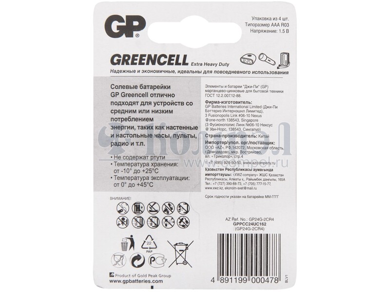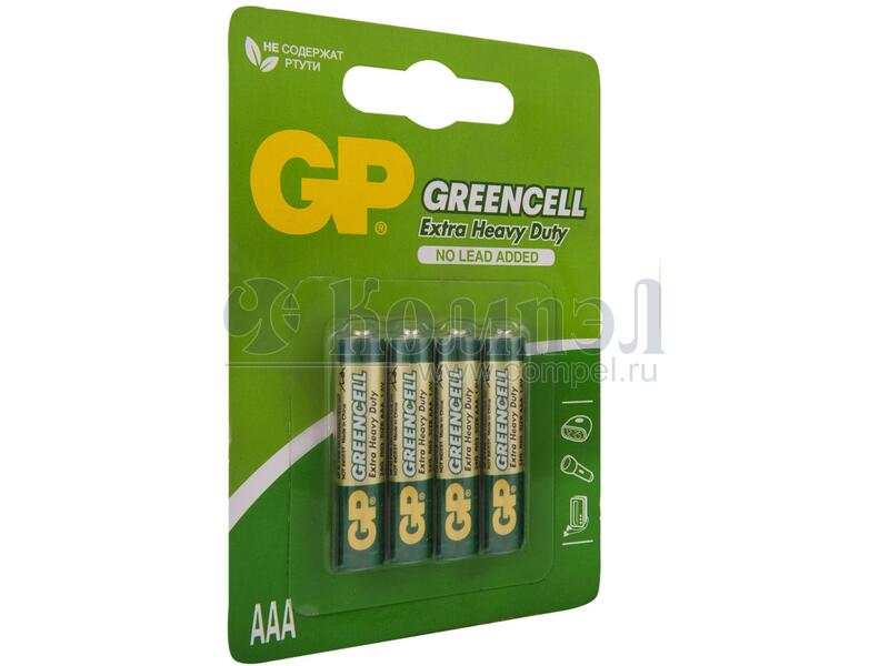Солевые батарейки GP GreenCell 24G AAA - 4 шт. в блистре (Китай) Характеристики: 1,5 В Типоразмер ААА, R03 Номинальная емкость: 600 мАч 4 шт. на блистере
