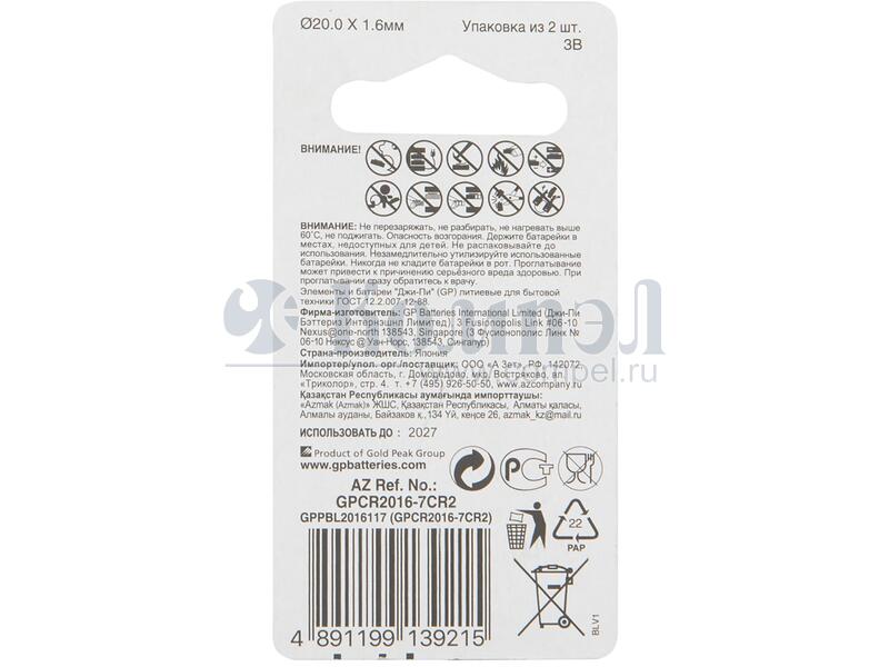 | Примечания | CR2016 blister-2, блистер, 2 шт. (4891199139215) |