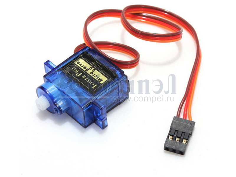Сервомашинка TowerPro SG90 Сервопривод используется в основном для управления небольшими легкими механизмами, угол поворота которых ограничен диапазоном от 0 до 180 градусов. Характеристики: Шестерни: пластик Скорость вращения (4.8В без нагрузки): 0.14 сек/60 градусов Усилие (момент вращения) (4.8В): 1.98 кг*см Материал редуктора: пластик Рабочая температура: - 10 + 60 С Рабочее напряжение: 3.5 - 8.4В Габариты: 22.6 x 21.8 x 11.4 мм Длина провода: 24.5cm Масса: 9 г. Сложности при работе с TowerPro SG90 сервоприводами. Недорогие сервоприводы не обеспечивают точных настроек начальной и конечной позиций. Часто в положении 0 и 180 градусов слышен характерный треск или жужжание. Это говорит о том, что механическая часть сервопривода уже находиться в предельной позиции, но датчик считает, что заданная позиция еще не достигнута. Проблему можно решить подбором скорректированных позиций. Например, часто вместо позиции 0 градусов нужно использовать позицию поворота сервопривода в 10-15 градусов, а конечную 165-170 градусов. Это позволит избежать лишних перегрузок и шума при достижении крайних точек. Следует обращать внимание на напряжение, которое используется при работе сервопривода. Если значение напряжения превышает допустимые значения из технических характеристик сервопривода, механические части могут выйти из строя или зубчатые колеса сервопривода провернутся в положение превышающее максимальные значения и механизм не сможет продолжать движение в обратном направлении. Иными словами, завышенное напряжение скорее всего не приведет к сгоранию мотора сервопривода, но повредит механические части зубчатых механизмов. Схема подключения сервопривода: Коричневый провод - Земля ( Ground, подключается к пину GND на плате Arduino ) Красный провод - Питание +5 V ( подключается к пину 5V на плате Arduino ) Желтый провод - Сигнал управления ( подключается к цифровому пину Arduino ) Комплектация: Сервомашинка - 1 шт Качельки - 3шт