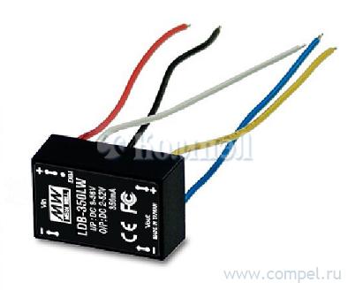 DC-DC LED драйвер. Входное напряжение 9-36 В, выходное напряжение 2-40 В, выходной ток 350 мА. Для объёмного монтажа, корпус с проводами.