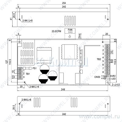 | ККМ, компенсация на проводах, ограничение тока, дистанционное Вкл/Выкл, сигнал DC OK, дополнительный выход 5 В Stand By | КЗ, перегрузка, перенапряжение, перегрев | — | |||||||||||||||||||||