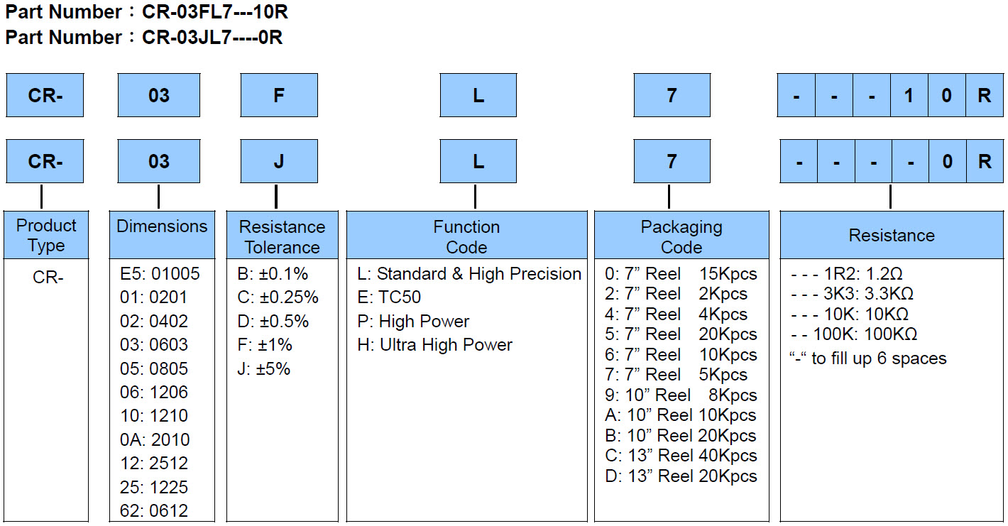 Серия CR включает в себя наиболее распространенные чип-корпуса, такие как 01005, 0201, 0402, 0603, 0805, 1206, 1210, 2010, 2512, 1225, 0612. Начальный допуск сопротивления резисторов CR имеет значения ±1% и ±5%, но для специальных применений можно выбрать более точные номиналы с допуском ±0.1%, ±0.25% и ±0.5%. Температурная нестабильность данных резисторов находится в диапазоне от ±100 до ±400 ppm в зависимости от номинала. Расшифровка артикула резистора серии CR представлена ниже: