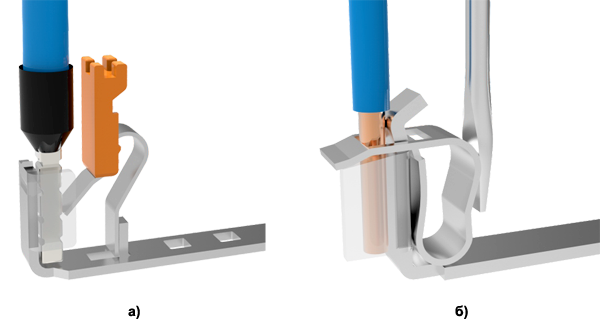 Рис. 11. Устройство пружинных зажимов клемм семейств DS (а) и WS (б)