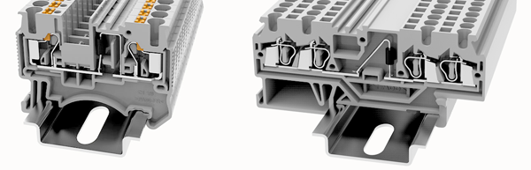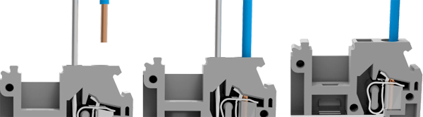 По способу присоединения проводов клеммы делятся на две основные группы: с пружинным зажимом и винтовым. Пружинный зажим позволяет максимально быстро осуществить монтаж, так как требует для присоединения провода минимального времени работы инструментом или позволяет и вовсе обойтись без него. Время расходуется лишь на подготовку концов проводов. На рисунке 11 показаны два варианта пружинных зажимов для клемм семейств DS и WS.