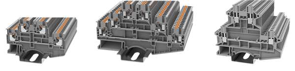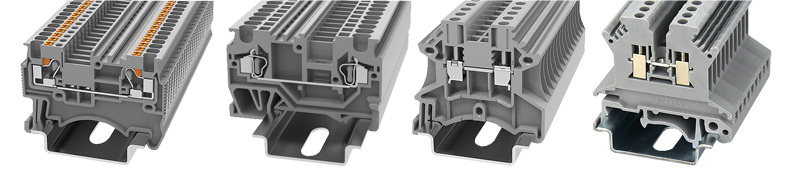Компания DEGSON предлагает клеммы различных конфигураций и назначений (рисунок 10): от обычных проходных для соединения двух проводов до имеющих дополнительный функционал, в том числе измерительных, с коммутируемым соединением, со встроенными диодом, с держателем для предохранителя. Наличие в одном корпусе нескольких уровней соединений и возможность их объединения в группы при помощи аксессуаров по горизонтали и вертикали (для многоуровневых) не только позволяют выполнить монтаж практически любой сложности, но и значительно упрощают последующие обслуживание и модернизацию оборудования.