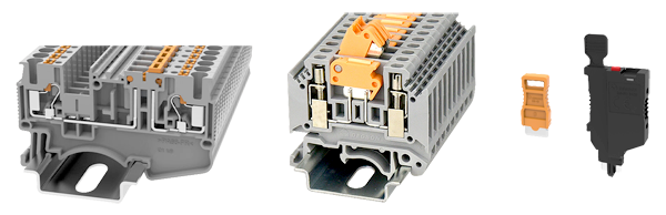 Клемма с размыканием также может служить основанием для различных аксессуаров, например, предохранительной вставки или отдельного ножа, замыкающего контакты (показаны на рисунке 21 справа).