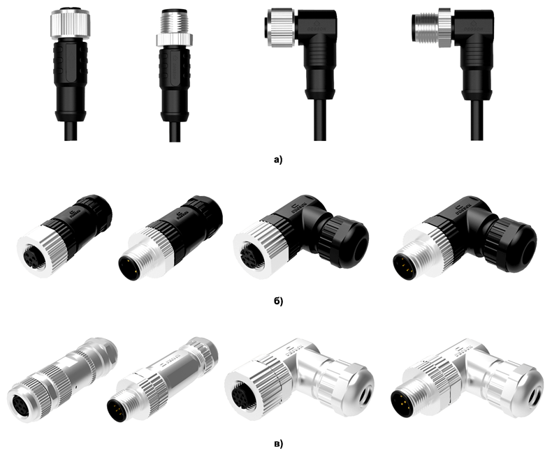 Рис. 3. Варианты исполнения разъемов семейств М8 и М12: а) литые с кабелем; б) для сборки; в) экранированные