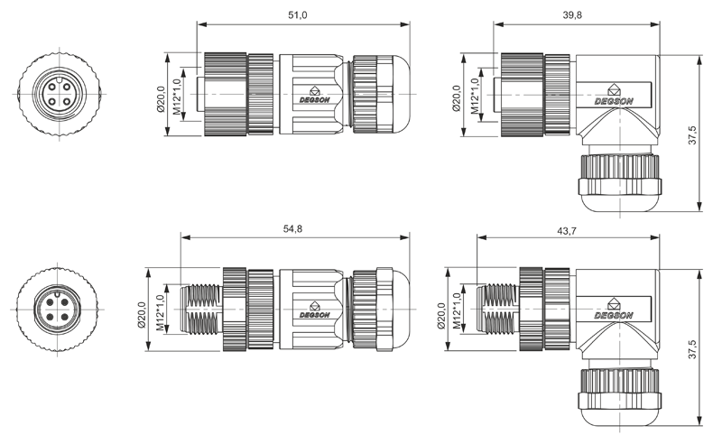 Компания DEGSON в 2016 году начала разработку и производство нескольких разновидностей цилиндрических (круглых) разъемов (рисунок 2), соответствующих стандартам IEC-61076. В настоящее время существуют три семейства: M5, M8 и M12, наименование которых означает внешний диаметр резьбового соединения. Наиболее востребованы в промышленной отрасли последние два. Они обеспечивают пыле- и влагозащищенное соединение класса IP67/68 и отличаются надежностью и вибростойкостью, что необходимо для качественной передачи сигналов и электроэнергии с помощью кабеля.