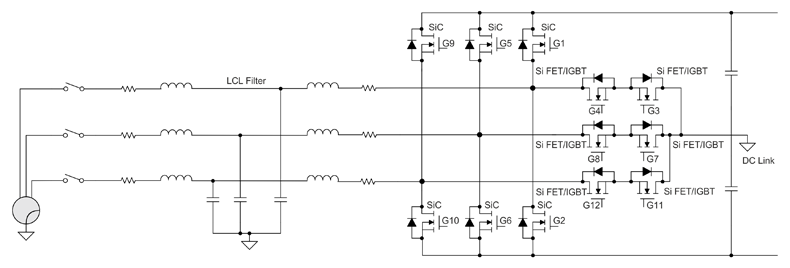 Особенность этой топологии заключается в том, что она требует высоковольтных ключей. Например, если напряжение постоянного тока составляет 800 В, то для силового каскада необходимы карбид-кремниевые транзисторы с номинальным напряжением 1200 В.