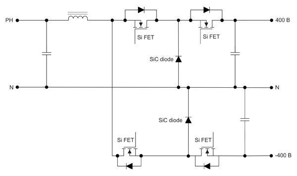 Во-вторых, данный многоуровневый преобразователь дает хорошие показатели в части электромагнитной совместимости (ЭМС) и имеет низкий уровень гармонических искажений, из-за чего на входе может быть использована менее громоздкая индуктивность. Компоненты на основе GaN/SiC можно применять в этой схеме только когда требуются очень высокие эффективность и плотность мощности. Наконец, преобразователь с фиксированной нейтралью обеспечивает поток энергии в двух направлениях.
