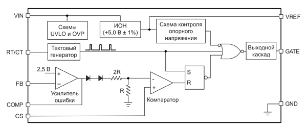 – схема отключения ШИМ-контролера при пониженном напряжении питания (UVLO) со встроенным гистерезисом, а также схема защиты от повышенного напряжения (OVP);