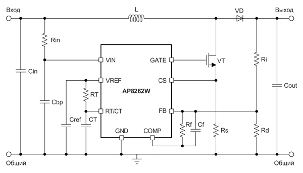 где +2,5 В – внутреннее опорное смещение усилителя ошибки ШИМ-контроллера AP8262WSE-A1, а сопротивление резистора Rd должно быть ниже 25 кОм (т.е. 2,5 В/100 мкА). В качестве блокировочных элементов Cbp и Cref производитель рекомендует использовать керамические конденсаторы номиналом 0,1 мкФ. Рекомендации по выбору остальных компонентов преобразователя даны выше (номиналы компенсирующих элементов Rf и Cf подбираются под конкретную физическую реализацию источника).