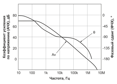 Рис. 3. Зависимость коэффициента усиления и фазы от частоты для усилителя ошибки AP8262WSE-A1