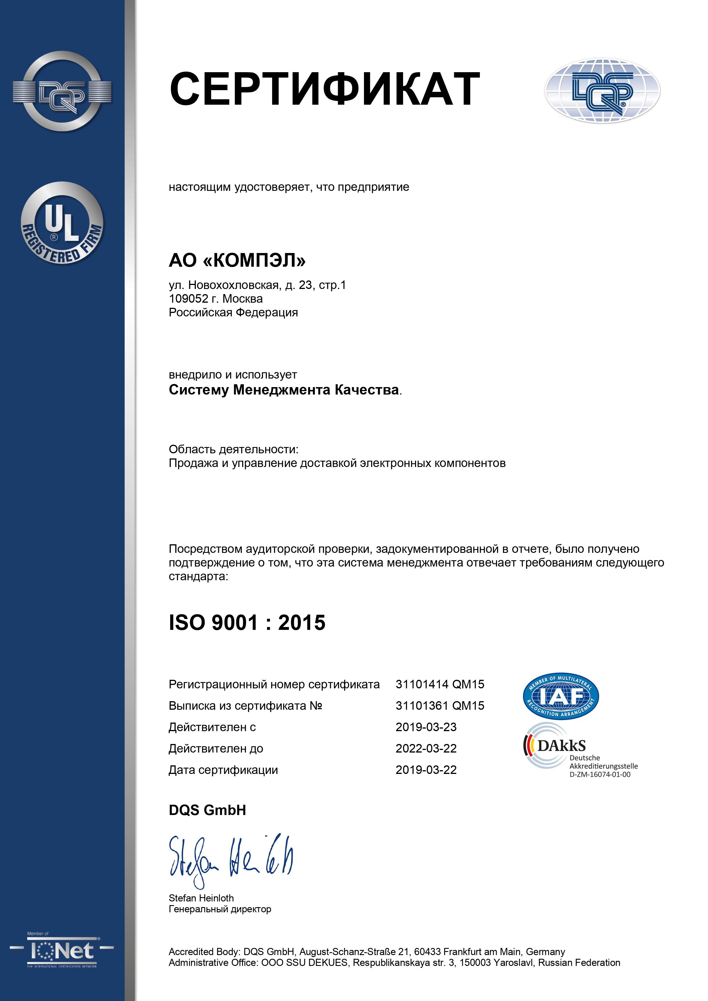 С 2013 года Компэл проходит сертификацию ISO 9001 ведущими мировыми сертификационными органами: Lloyd’s, Veritas, DQS и другими.