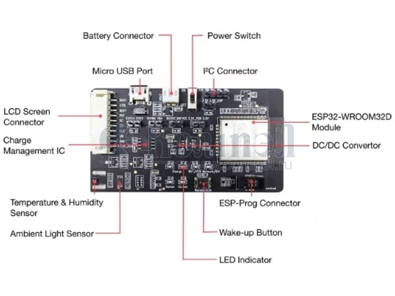 | ESP32-WROOM-32 [8MB] (ESPRES) | 1 шт | GPIO, I²C, I²S, PWM, SDIO, SPI, UART | — | 18×25.5×3.1 мм | |||||||||